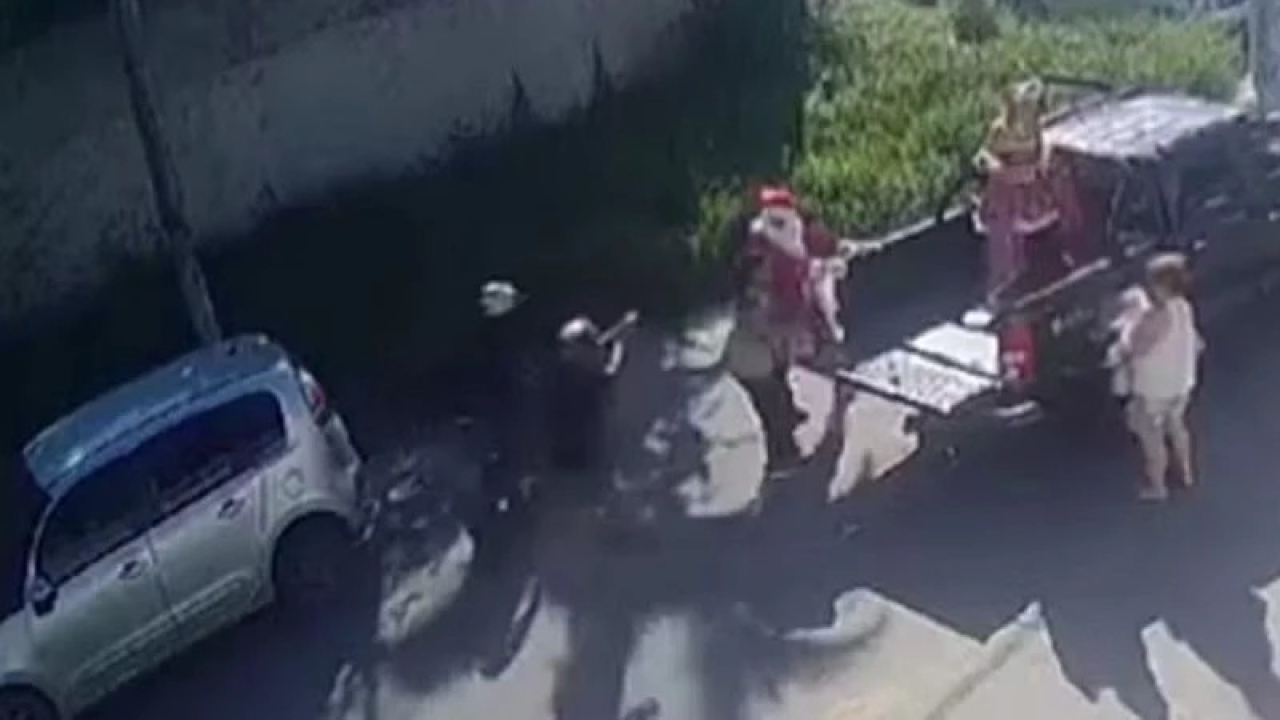 Em vídeos divulgados nas redes sociais, é possível ver o momento em que dois homens em cima de uma motocicleta abordam as pessoas. Ambos usam capacete e um deles segura uma arma. O Papai Noel está ao lado da caminhonete. Em cima do veículo, está a assistente dele.
