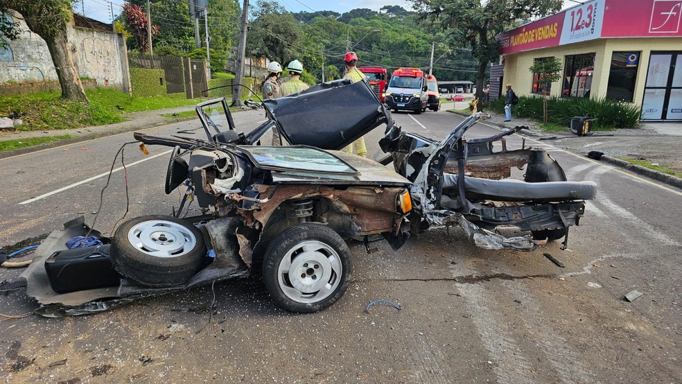 Carro partiu no meio após bater em poste, em Curitiba — Foto: Corpo de Bombeiros