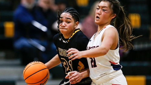 Denay Jones (21) de Morris Knolls tenta passar por Mae Albregts (21) de Mountain Lakes durante o jogo de basquete feminino entre Morris Knolls e Mountain Lakes na Morris Knolls High School em Denville, NJ, na segunda-feira, 12 de fevereiro de 2024.Scott Faytok | Mídia avançada de NJ