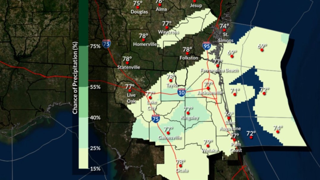 O Serviço Meteorológico Nacional em Jacksonville prevê manhãs frias no fim de semana com potencial de congelamento leve no interior na manhã de domingo, juntamente com potencial de geada generalizada.