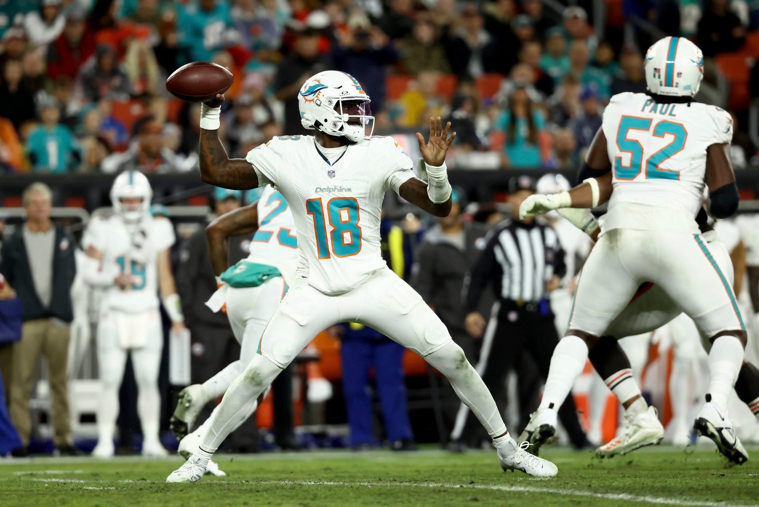 QB Tyler “Snoop” Huntley. O quarterback reserva está na fila para fazer sua quinta partida como titular em Miami se a lesão no quadril de Tua Tagovailoa o deixar de lado pelo segundo jogo consecutivo. Huntley disse que se sentiu confortável contra o Cleveland na semana passada, quando começou e completou mais de 80% de seus passes para 225 jardas com um lançamento de TD e uma corrida de TD. Huntley, uma ameaça para estender as jogadas com as pernas, liderou os Dolphins na corrida com 52 jardas em sete tentativas.