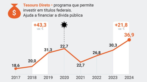 Investidores recompraram (resgataram antes do vencimento) R$ 36,9 bilhões em títulos do programa Tesouro Direto em 2024. Houve um aumento de 21,8% na retirada de dinheiro do programa na comparação com o ano anterior. Essa é a maior variação anual desde 2019, quando a alta foi de 43,3%.