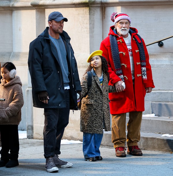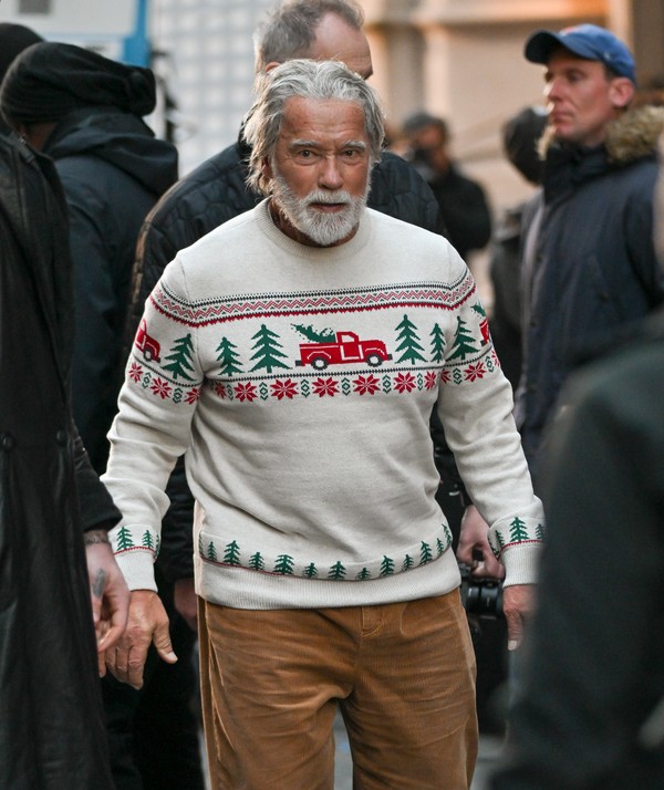 Schwarzenegger, que apareceu de barba e cabelos brancos, e roupas natalinas, ele foi visto o set de filmagens do longa The Man With The Bag, do qual ele é o protagonista. Nas imagens, ele aparece contracenando com Alan Ritchson e Berkeley James enquanto caminhavam pelas ruas de Nova York.