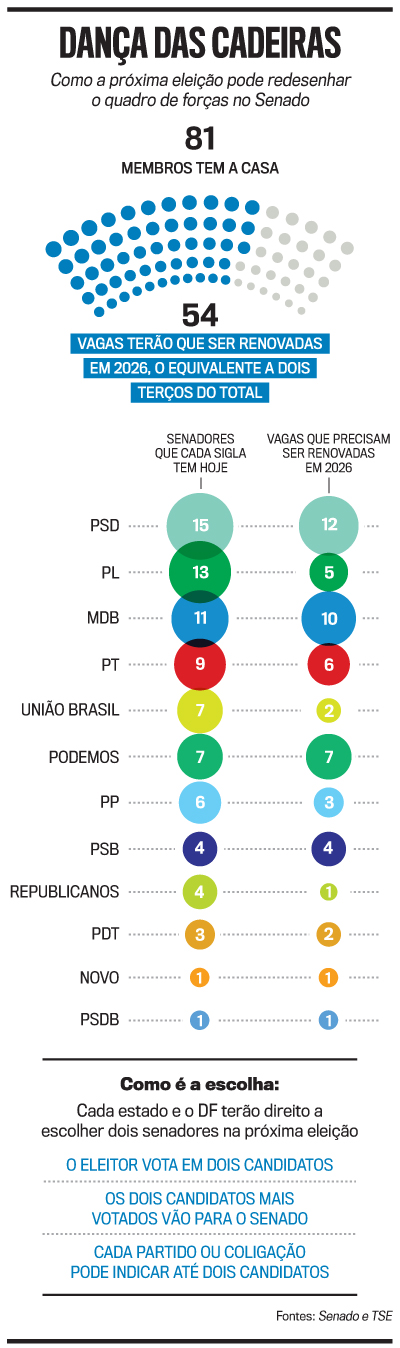 A preocupação do presidente em ampliar a capacidade de sua tropa para o jogo duro faz sentido. Os partidos que mais terão de renovar seus mandatos em 2026 são da base. Somados, MDB, PSD e PT, por exemplo, terão 28 cadeiras em disputa, mais da metade do total em jogo em 2026 (veja o quadro). No Senado, essas duas siglas de centro têm parlamentares alinhados ao governo, como Renan Calheiros, Jader Barbalho e Eduardo Braga, do MDB (os três caciques têm mandato até 2026), e Eliziane Gama, Otto Alencar e Omar Aziz, pelo PSD. Quadros petistas importantes terão de renovar seus mandatos, como Randolfe Rodrigues (líder do governo no Congresso), Jaques Wagner (líder no Senado) e Humberto Costa, um dos principais dirigentes do PT.
