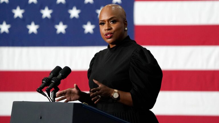 A deputada Ayanna Pressley fala em um comício de campanha em Boston em 2022. Maria Schwalm