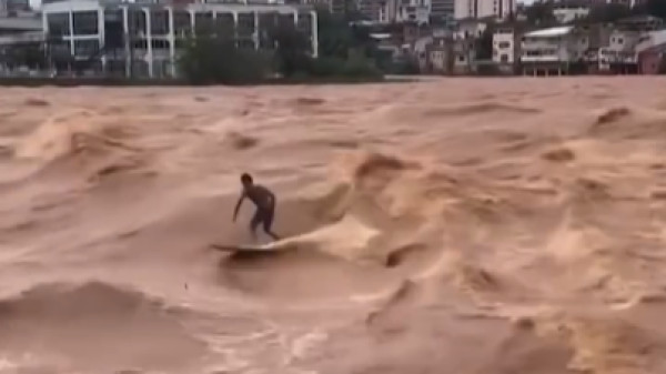 Um homem foi flagrado surfando nas águas do Rio Doce. Isso foi em Governador Valadares, interior de Minas Gerais.