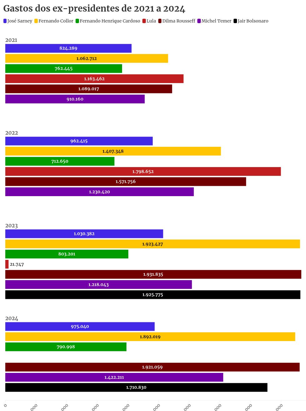 Depois de Dilma Rousseff, quem teve o maior gasto foi Collor (R$ 1,89 milhões), seguido por Bolsonaro (R$ 1,71 milhões) e Temer (R$ 1,42 milhões). Sarney e FHC figuram nas duas últimas colocações, com despesas de R$ 975 mil e R$ 790 mil respectivamente.