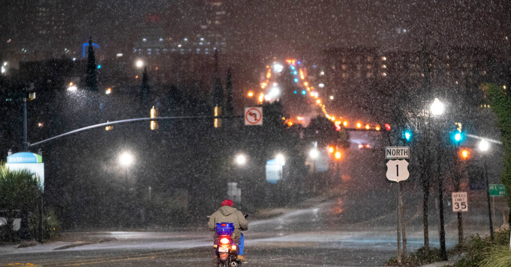 Uma rara tempestade de inverno no sudeste atingiu as Carolinas na manhã de quarta-feira, ameaçando até quinze centímetros de neve nas comunidades costeiras, enquanto o ar frio deixava a Costa do Golfo e outras partes da região preparando-se para estradas perigosas e geladas.