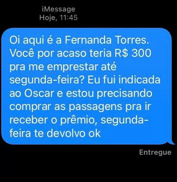 “Oi, aqui é a Fernanda Torres. Você por acaso teria R$ 300 pra me emprestar até segunda-feira? Eu fui indicada ao Oscar e estou precisando comprar as passagens pra ir receber o prêmio, segunda-feira te devolvo, ok”, prometeram.