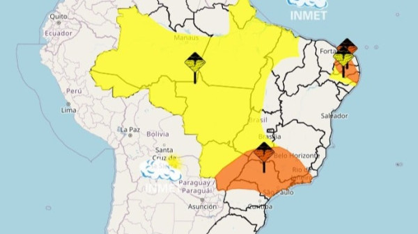 O Inmet também alertou para o perigo de chuvas intensas no Norte e no Centro-Oeste do país. Os Estados afetados são Mato Grosso do Sul, Mato Grosso, Goiás, Tocantins, Pará, Amapá, Amazonas, Acre e Roraima.