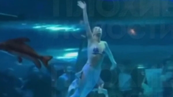 Um peixe gigante atacou o rosto de uma jovem sereia durante apresentação na cidade de Xishuangbanna, na China.