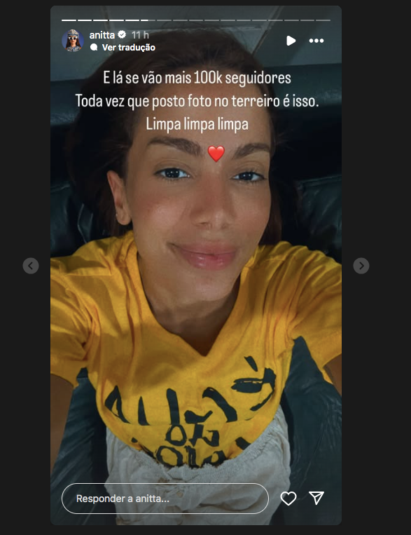 As imagens foram compartilhadas nos stories do Instagram. A artista disse que toda vez que posta esse tipo de conteúdo, perde seguidores.