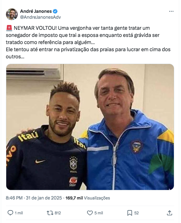 – NEYMAR VOLTOU! Uma vergonha ver tanta gente tratar um sonegador de imposto que trai a esposa enquanto está grávida ser tratado como referência para alguém. Ele tentou até entrar na privatização das praias para lucrar em cima dos outros – escreveu.