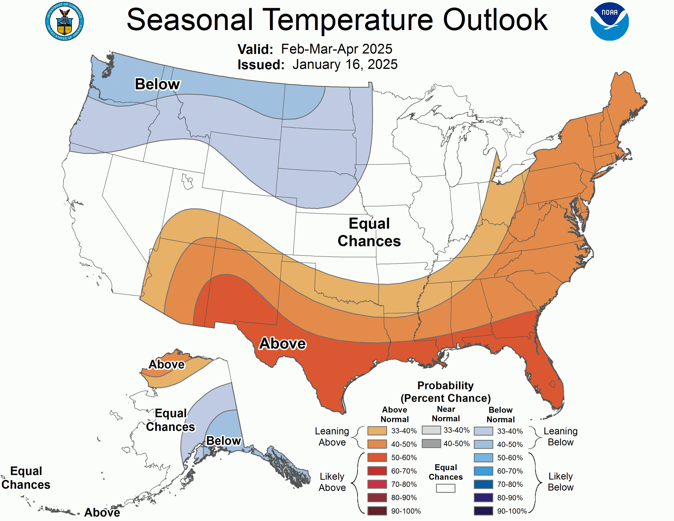 As perspectivas de 90 dias do Centro de Previsão Climática da NOAA, que foram emitidas em 16 de janeiro, mostram que as condições fracas de La Niña estão presentes e esperam que durarem de fevereiro a abril.