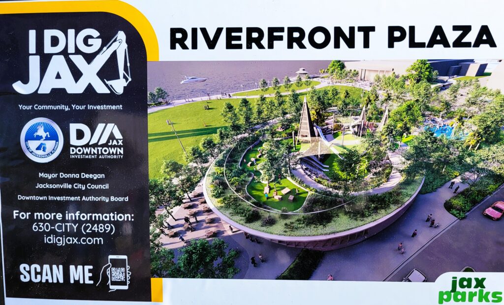 A Riverfront Plaza está subindo no local do antigo Landing de Jacksonville em Independent Drive, o primeiro de uma série de parques e outras comodidades planejadas para a beira do rio St. Johns. A cidade também tem planos para espaços gramados que já mantiveram o ex -tribunal e a prefeitura, bem como os estaleiros em frente à Maxwell House.