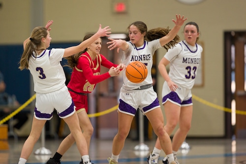 Angelisa Kearns, de Edison (23), batalha contra a bola contra Nicole Turco (3) e Katelyn Louro de Monroe nas quartas de final de basquete feminino da GMC High School em Edison. Os Falcons passaram pelos Eagles por uma vitória por 58 a 39. 02/11/2023Steve Hockstein | Para NJ Advance