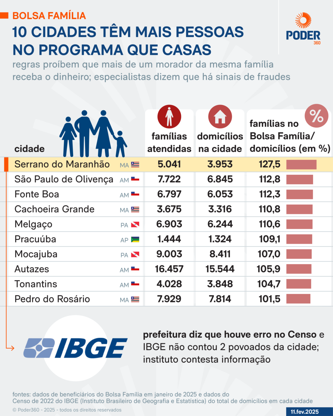 A situação mais extrema ocorre em Serrano do Maranhão (MA), onde há 3.953 domicílios registrados pelo Instituto Brasileiro de Geografia e Estatística (IBGE), mas 5.041 famílias cadastradas no Bolsa Família — o que representa 127,5% do total de residências.