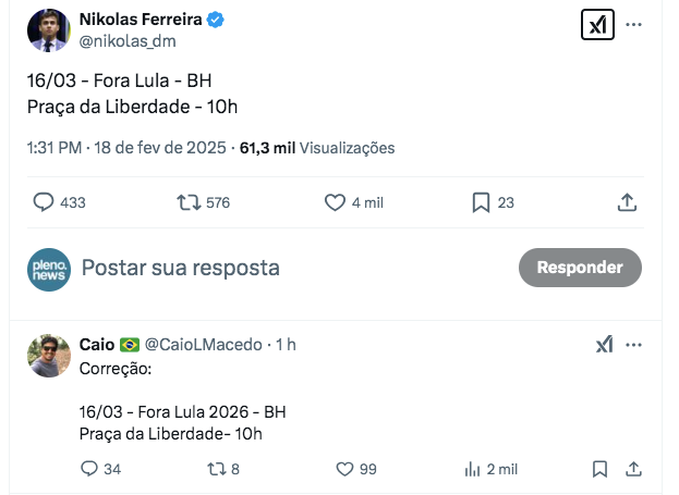 Nesta terça-feira (18), o deputado federal Nikolas Ferreira (PL-MG) anunciou horário e o local do ato contra Lula (PT), que foi marcado para o dia 16 de março, em várias cidades. O parlamentar forneceu informações sobre Belo Horizonte (MG).