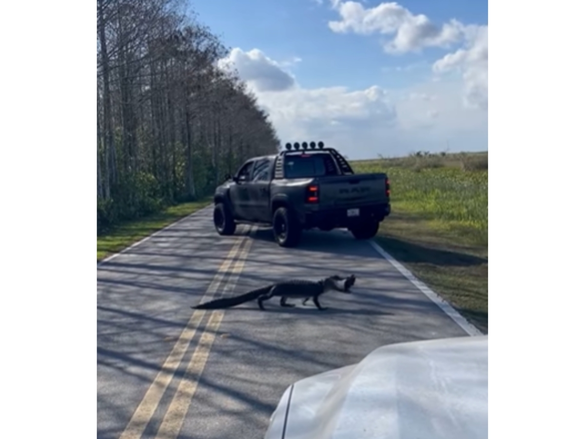 Boynton, Beach, FL – Um jacaré carregando uma tartaruga fechou o tráfego no sul da Flórida, enquanto atravessava uma estrada para um lago próximo, e foi capturado na câmera pelo Serviço de Peixes e Vida Selvagem dos EUA. (Assista ao vídeo abaixo.)