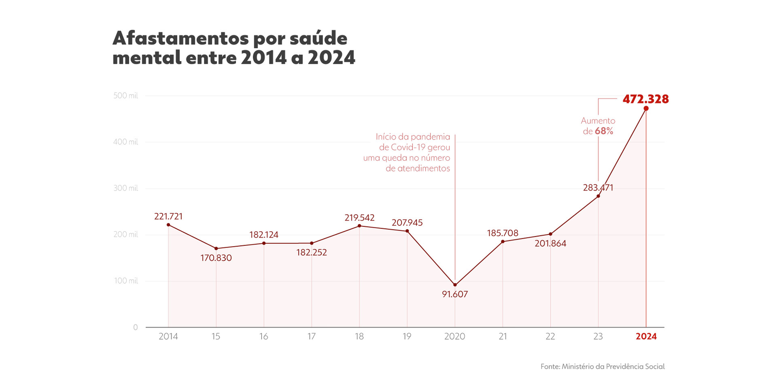 Em 2024, foram 3,5 milhões pedidos de licença no INSS motivados por várias doenças. Desse total, 472 mil solicitações foram atendidas por questões de saúde mental. No ano anterior, foram 283 mil benefícios concedidos por esse motivo. Ou seja, um aumento de 68% e um marco na série histórica dos últimos 10 anos. (Veja a evolução no gráfico abaixo)