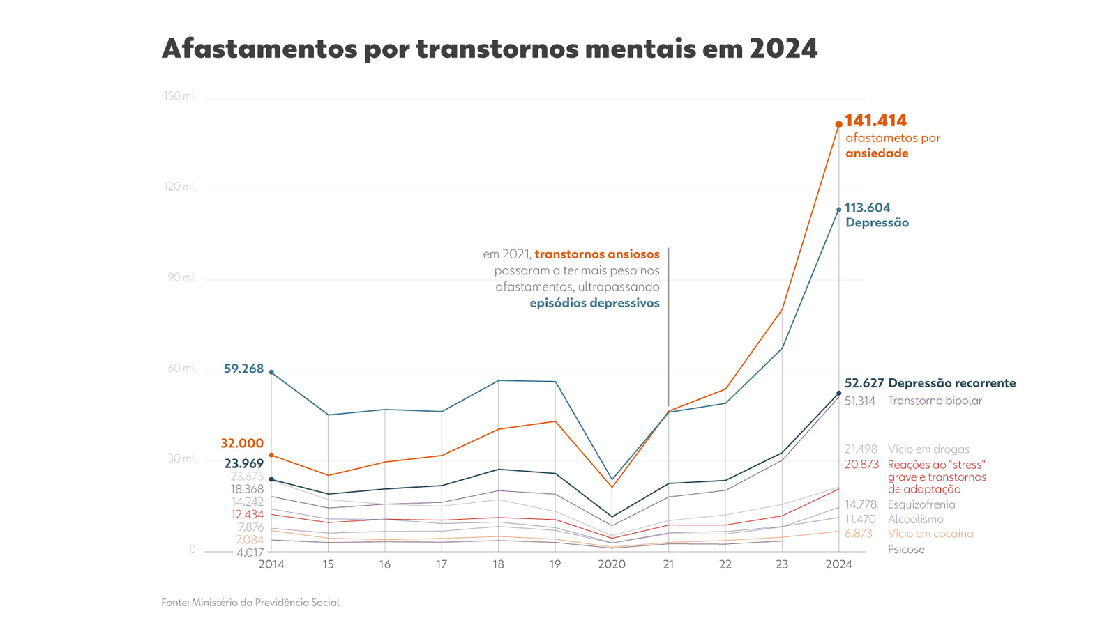 O número acima traz a lista de doenças de saúde mental que mais geraram concessão de benefícios por incapacidade temporária. O burnout, por exemplo, não está nessa lista. No ano passado, foram 4 mil afastamentos por esse motivo. Os especialistas explicam que o número tem relação com a dificuldade do diagnóstico.