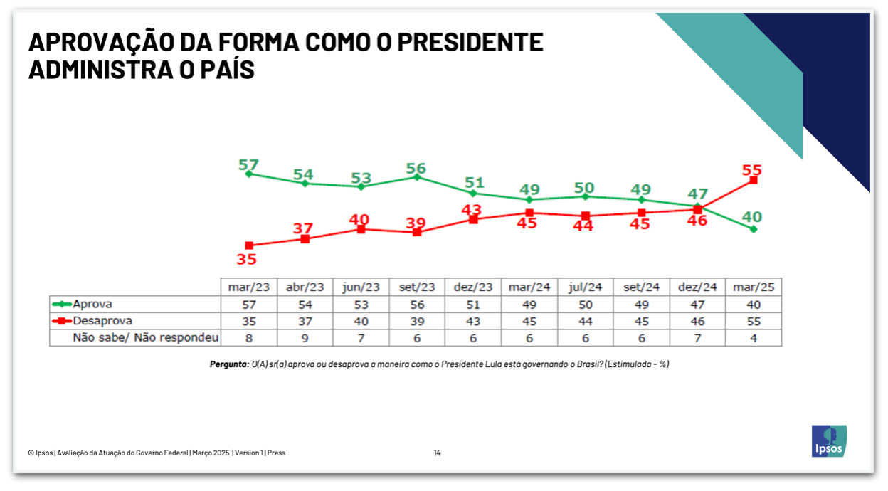 O levantamento também avaliou o nível de confiança no presidente da República. Segundo a Ipsos-Ipec, esse índice caiu 5 pontos percentuais desde setembro de 2024, quando 45% dos brasileiros disseram confiar em Lula. Hoje apenas 40% dizem confiar no presidente, enquanto 58% disseram não confiar.