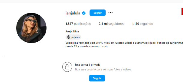A primeira-dama Janja da Silva privou sua conta no Instagram nesta quinta-feira (13), impedindo que usuários que não a sigam entrem no perfil.
