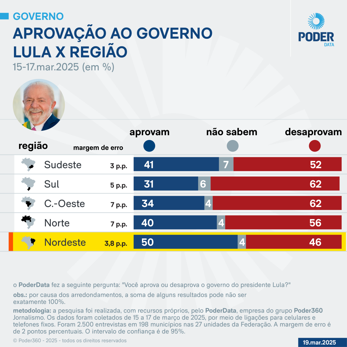 Os dados estratificados por região mostram que só na região Nordeste o governo é aprovado por 50% dos eleitores. No Sul e no Centro-Oeste, a gestão petista é desaprovada por 62%.