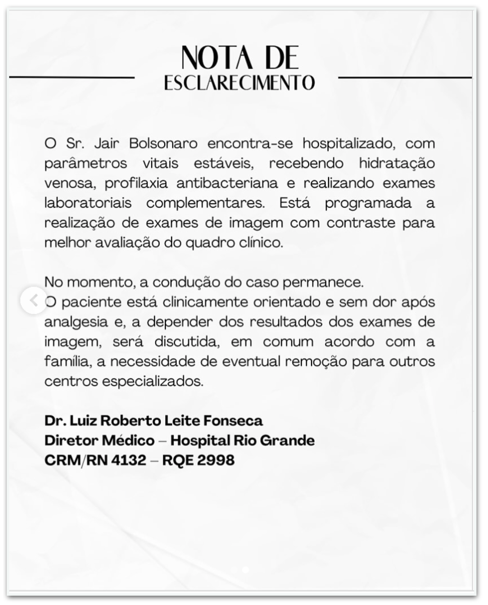“Jair Bolsonaro encontra-se hospitalizado, com parâmetros vitais estáveis, recebendo hidratação venosa, profilaxia antibacteriana e realizando exames laboratoriais complementares. Está programada a realização de exames de imagem com contraste para melhor avaliação do quadro clínico“, diz a nota.