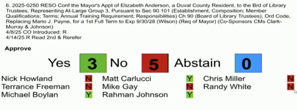 Ativistas conservadores se manifestaram contra Andersen na reunião de regras, enquanto vários líderes democratas proeminentes, incluindo o ex -senador estadual Audrey Gibson e o presidente do Partido Democrata Duval, Daniel Henry, falou em sua defesa.