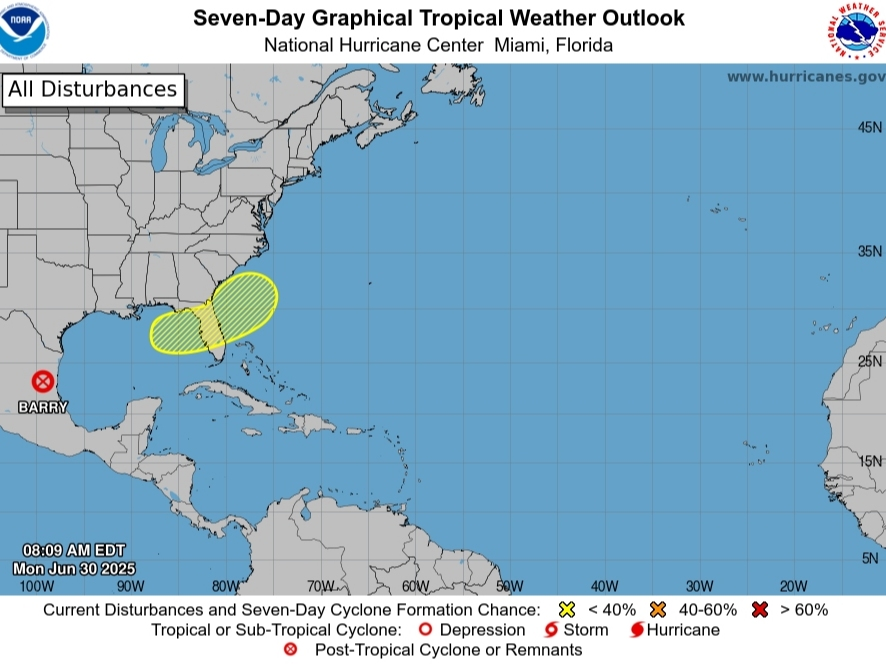 O sistema está aparecendo como a segunda tempestade da temporada de furacões do Atlântico de 2025, Tropical Storm Barry, fracassa. Ainda assim, os remanescentes de Barry estão trazendo fortes chuvas para o leste do México no leste.