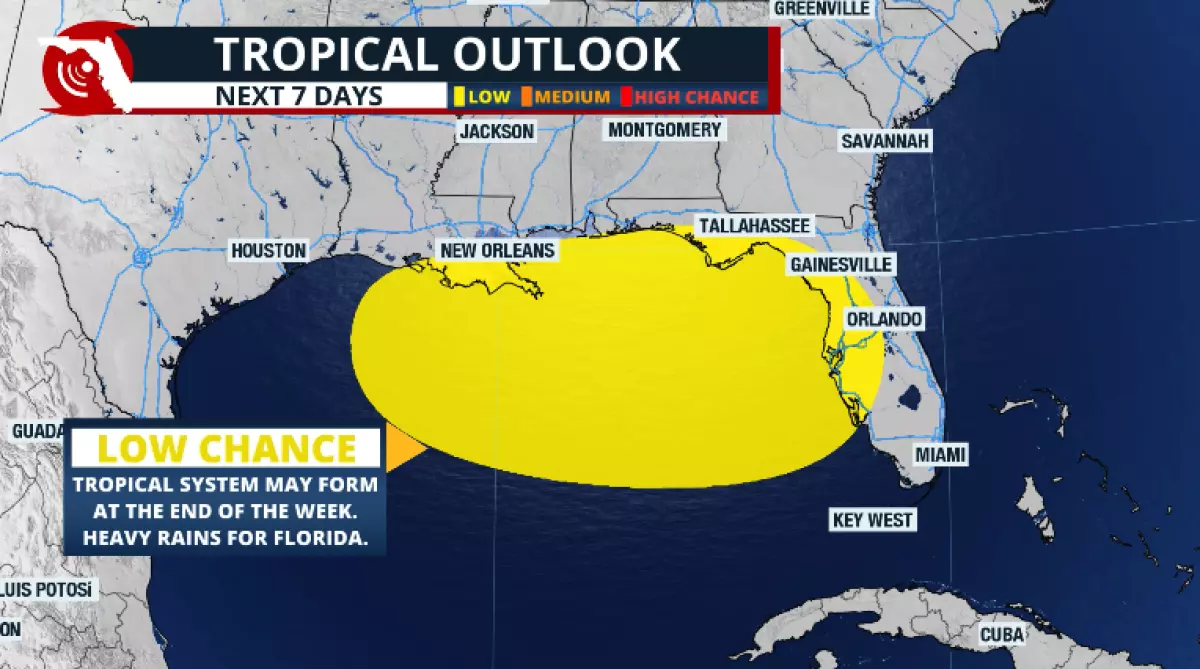 Um sistema meteorológico sobre o norte da Flórida, que se estende pelo Noroeste do Golfo, tem 30% de chance de desenvolvimento tropical nos próximos sete dias, diz o National Hurricane Center.