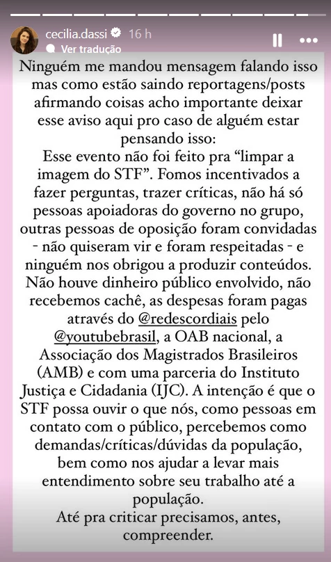 – A intenção é que o STF possa ouvir o que nós, como pessoas em contato com o público, percebemos como demandas/críticas/dúvidas da população, bem como nos ajudar a levar mais entendimento sobre seu trabalho até a população. Até pra criticar precisamos, antes, compreender – escreveu Dassi nos stories de seu perfil no Instagram.