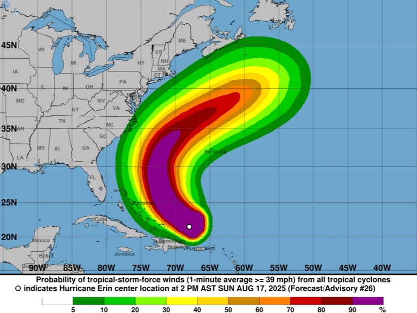 “Erin tem crescido em tamanho, e essa tendência provavelmente continuará nos próximos dias. O campo de vento em expansão resultará em condições ásperas do oceano em grande parte do Atlântico Ocidental”.