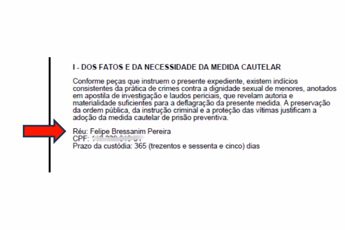 Cayo atribuiu ao youtuber, como consta no mandado fraudado, “crimes contra a dignidade sexual de menores” com “autoria e materialidade suficientes para a deflagração da presente medida”. O criminoso apontou falsamente Felca com autor de um dos vários tipos de crime cometidos, de fato, pela Country em grupos de Discord ou Telegram.