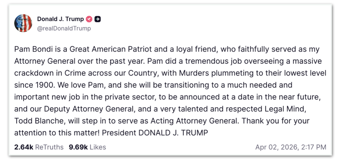“Pam Bondi é uma grande patriota norte-americana e uma amiga leal, que serviu fielmente como minha procuradora-geral durante o último ano. Pam fez um trabalho excepcional supervisionando uma repressão massiva ao crime em todo o país, com os homicídios caindo para o nível mais baixo desde 1900. Amamos Pam, e ela fará a transição para um novo emprego muito necessário e importante no setor privado, cuja data será anunciada em breve, e nosso procurador-geral adjunto, um jurista muito talentoso e respeitado, Todd Blanche, assumirá como procurador-geral interino. Agradeço a atenção dispensada a este assunto!”, escreveu Trump.