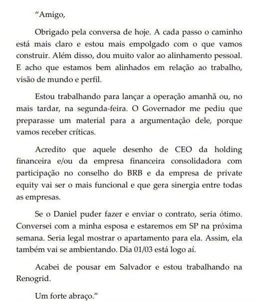 As conclusões se baseiam, entre outros elementos, em mensagens que indicam alinhamento entre os dois. Em uma delas, Costa afirma: “Estou com vc. Continuo no deal mode. Estou virando noite e tentando resolver”. Em outra, destaca o “alinhamento pessoal” e diz estar “empolgado com o que vamos construir”.
