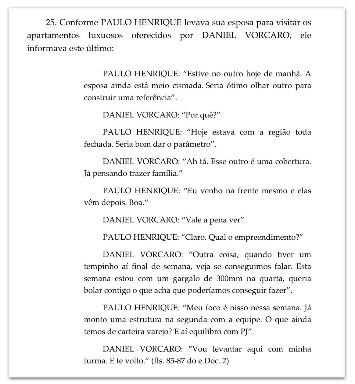 “Sob a segunda perspectiva, os autos informam que PAULO HENRIQUE teria aceitado vantagem indevida estimada em R$ 146.582.649,50, representada por seis imóveis de luxo e elevadíssimo padrão, escolhidos segundo critérios pessoais e familiares, em tratativas mantidas diretamente com DANIEL VORCARO, com corretora de confiança deste e com integrantes do escritório de DANIEL MONTEIRO (que, aparentemente, prestava serviços diretamente a DANIEL VORCARO). A documentação policial descreve que os bens eram tratados como ‘cronograma pessoal’ de PAULO HENRIQUE, que o investigado visitava ou validava os imóveis selecionados, que cobrava andamento das aquisições e que chegou a demonstrar preocupação com a falta de documentação formal do arranjo, o que reforça a consciência acerca do caráter dissimulado da operação. Há, ainda, elemento específico segundo o qual o próprio PAULO HENRIQUE solicitou que se deixasse em branco o campo de adquirente de imóvel, sob a justificativa de que estaria compondo uma holding familiar, dado que, em tese, converge com a estratégia de ocultação patrimonial”.