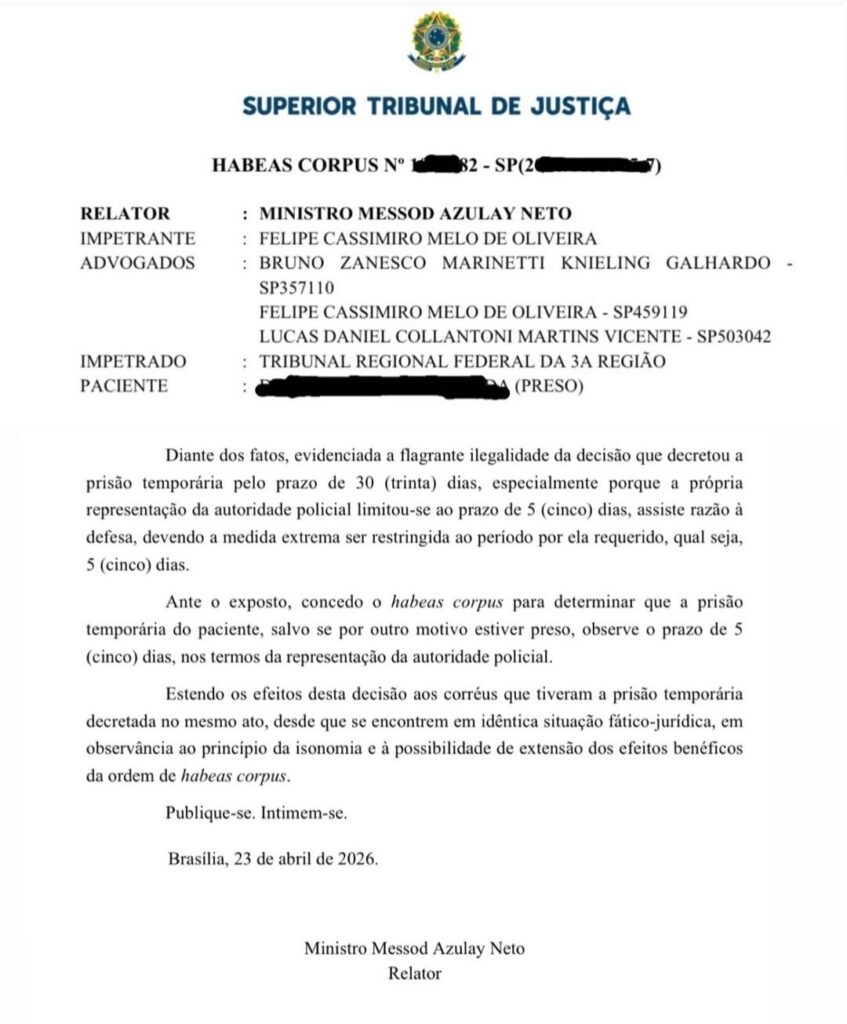O ministro do Superior Tribunal de Justiça (STJ) Messod Azulay Neto acaba de conceder habeas corpus e determinar a soltura do funkeiro MC Ryan SP, preso no dia 15 durante megaoperação da Polícia Federal (PF).