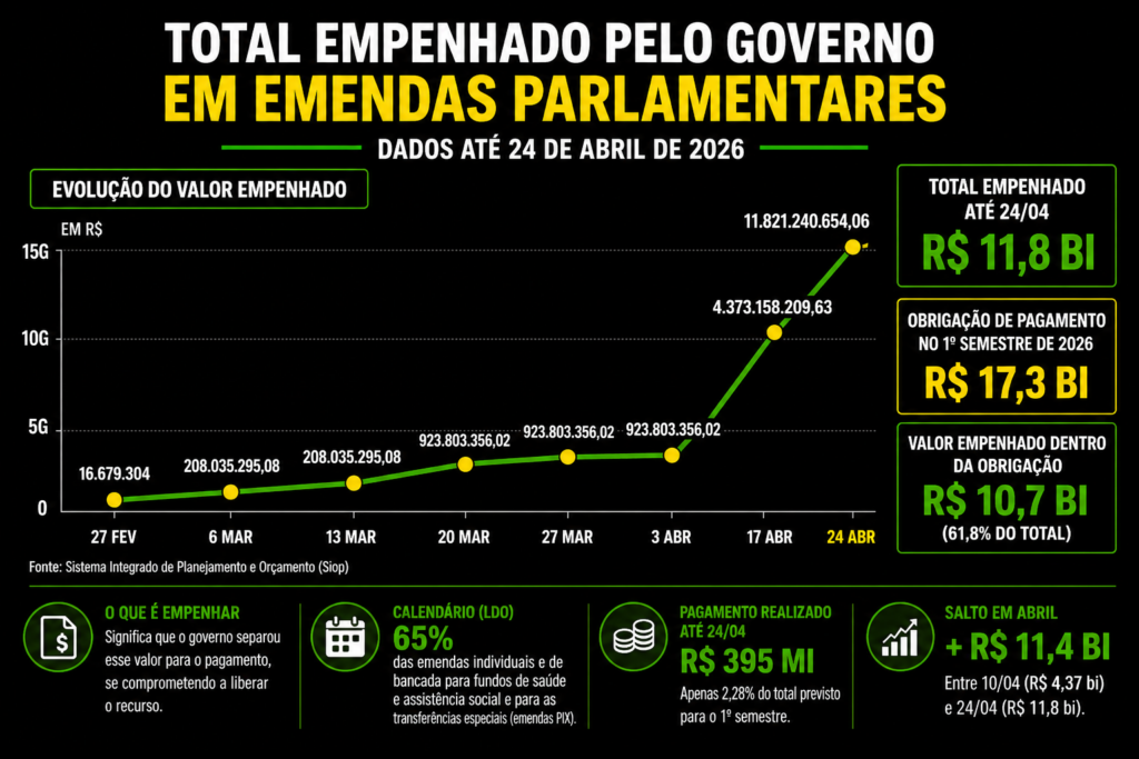 Os dados mostram avanço concentrado ao longo de abril. Em 27 de março, o total empenhado era de R$ 923,8 milhões. Em 10 de abril, subiu para R$ 4,37 bilhões. Em 17 de abril, chegou a R$ 11,8 bilhões. Em 24 de abril, se aproximou de R$ 12 bilhões.