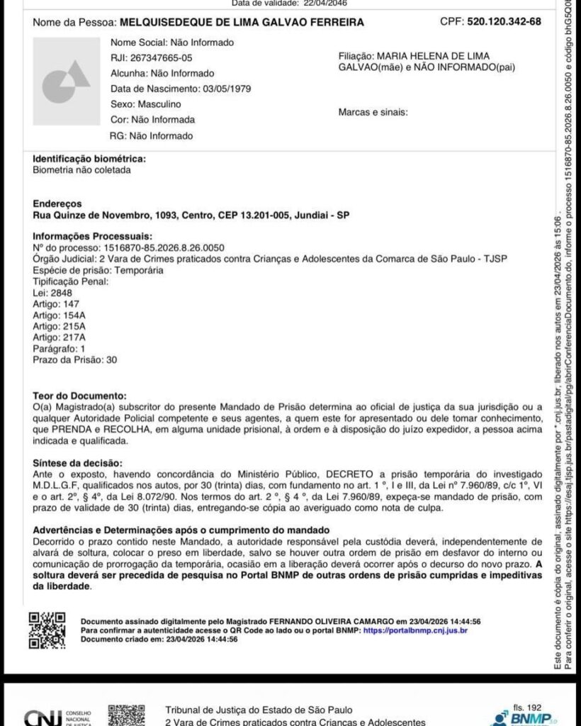 A Polícia Civil de São Paulo (PCSP) prendeu nesta terça-feira (28) o treinador de jiu-jitsu Melquisedeque de Lima Galvão Ferreira, mais conhecido como Melqui Galvão, por suspeita de crimes sexuais contra alunas.