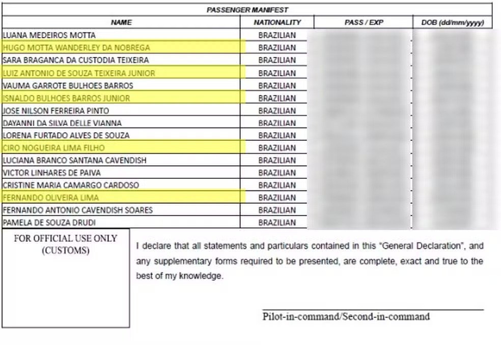 De acordo com a lista de passageiros obtida pela investigação, estavam a bordo o presidente da Câmara, Hugo Motta (Republicanos-PB), o senador Ciro Nogueira (PP-PI), além dos deputados Doutor Luizinho (PP-RJ) e Isnaldo Bulhões (MDB-AL). O proprietário da aeronave também integrava o grupo.
